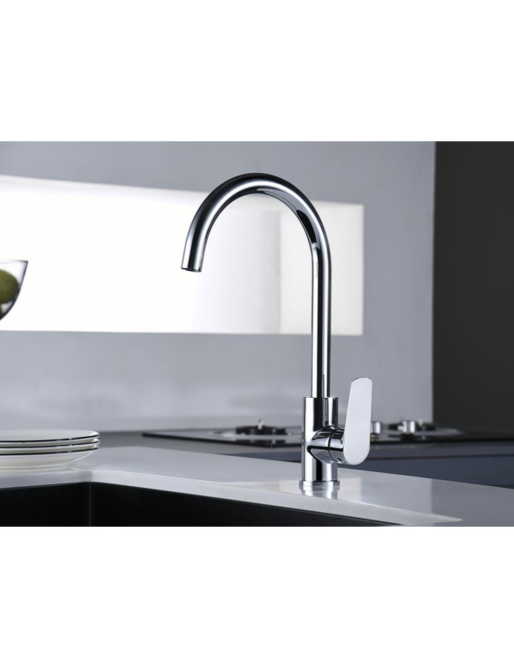 Grifo repisa monomando vertical, tubular, de caño curvo y alto, y cromado de latón, con latiguillos 50 cm. Serie LYON de IMEX |